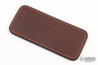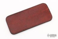 This leather slip sheath by Robertson Leather Works features lizard skin. It is 5.5" long by 2.5" wide. New from maker at the 2023 Blade Show West.