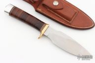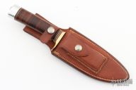 This Model 11-5 by Randall Made Knives features a satin finished blade with notched thumbrest, .224" stock and 1.375" blade depth, hidden tang construction. The handle has a brass guard, stacked leather grip and duralumin butt. This knife has stacked leather and red/black/yellow spacers. Comes with brown leather sheath. Has patina, and some light scuffs and scratches. Great condition otherwise.