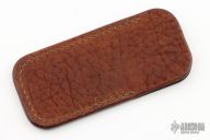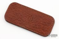 This leather slip sheath by Robertson Leather Works features brown leather. It is 3.75" long by 1.75" wide. New from maker at the 2023 Blade Show West.
