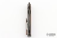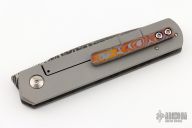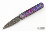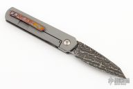 This Deville Front Flipper by Enrique Pena features a Chad Nichols Damascus blade with swedge, notched thumbrest and front flipper. The handle has a ZircuTi and bead blasted titanium frame with ZircuTi tip up clip. Nice detent, lockup and blade seating. Comes with zippered case. New from maker at the 2023 Blade Show West.