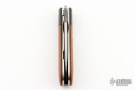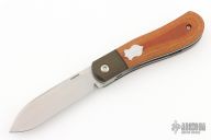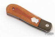 This Dogleg Front Flipper by Enrique Pena features a hand rub satin finished drop point blade with a notched thumbrest and front flipper. The handle has green canvas micarta bolsters, natural canvas micarta scales over black liners, titanium liners, brown canvas micarta backspacer.  Stainless steel shield. Includes padded zippered case. New from maker at the 2023 Blade Show West.