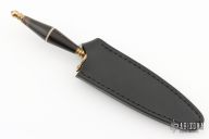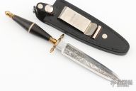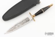 This dagger by Toledo features a satin finished blade with etchings on both sides, .112" blade stock and .832" blade depth, hidden tang construction. The handle has a brass guard and butt with buffalo horn grip with bone spacer. Comes with a black leather sheath. Has some light scratches, otherwise excellent condition.