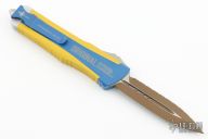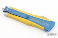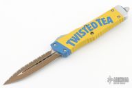 This Combat Troodon OTF automatic features a bronze coated D/E blade with one fully serrated edge. The handle is composed of an aluminum frame with "Twisted Tea" motif. Stainless steel clip. Glass breaker. "Memento Mori" on clip. Excellent condition. Comes with original box and papers