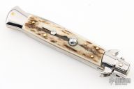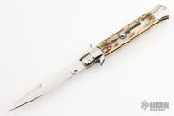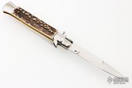 This 9" Picklock by Frank Beltrame features a satin bayonet ground blade with false top edge. The handle has stainless steel bolsters, front and rear, stag scales, brass liners, stainless spring. Comes with a leather slip. Excellent condition. This one has been tuned and polished by Greg Effects.