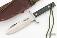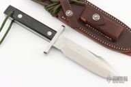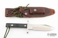 This Model 17 Astro by Randall features a satin finished spear point blade with false top edge, .221" blade stock, 1.408" blade depth, full tang construction. Black linen micarta scales, fastened with removable stainless steel bolts. A slot in the heavy tang and matching hollow inside the handle may be used to carry matches, fishhooks, line and other survival items. The Model 17 was especially designed for the seven Mercury astronauts who carried them on America's first manned space flights. Astronaut Gordon Cooper did the final design, and two of these historically valuable knives are on display in the Smithsonian Institution. Includes brown leather sheath with stone and original paper wrapping. New from maker.