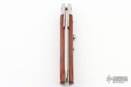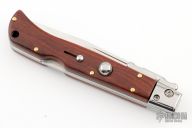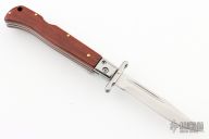 This Swing Guard Lockback Auto by AKC Italy has a polished stainless steel clip point blade with false top edge. The handle has wood scales with stainless steel bolsters, liners, and stainless steel back spacer and lock.  This knife has been professionally tuned and polished by Greg's Effects.  Includes a sheath.  Excellent Condition.