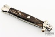 Angelo Campolin Sr. was born in 1923 in Maniago, Italy. He worked on perfecting his knife making skills before WWII and at this time made his first switchblades. After the war, in 1947 he started his company and made 30 stilettos with the marking “Angelo Campolin”. In the 1970’s Angelo’s son Gianni started to work in the company and they were specializing in folding hunting knives and also manual folding stilettos for the Robert Klaas company in Solingen Germany with their Kissing Cranes mark. In 2002 American switchblade collectors Dan Fuller, Brad West, and Tim Zinser were visiting Maniago and enjoying a few glasses of wine in a bar with Angelo Jr. and Gianni. The discussion was about a new name for some knife projects they wanted to pursue. It was Brad West that suggested the tang stamp should be AGA, for Angelo, Gianni, Angelo, thus representing three generations in the knife making business. The Campolins liked it and it stuck. In the beginning it was just a few items, but grew to the point where now there are 12 models and different scale options. The goal has been to offer quality switchblades using the old methods and traditions. Being a collector himself, Angelo Jr. knows what others like. The company headquarters has moved to Austria with production still in the original Maniago shop, as well as the others in Maniago that produce the knives for A.G.A. Campolin.
