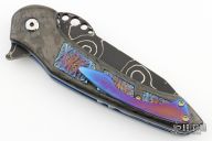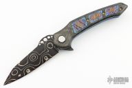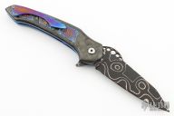 This knife by Cory Martin features a 1095 and Nickel Damascus blade with flipper. The handle has carbon fiber scales with texturetech titanium inserts, anodized titanium tip up clip, anodized titanium liners, matching Damascus backspacer with 3 barrel spacers. Nice detent, lockup and blade seating. Excellent condition.