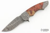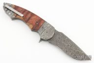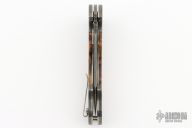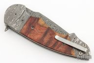 This Scorpion Flipper from Butch Ball features a Damascus blade with notched thumbrest and flipper. The handle is comprised of matching Damascus bolsters, front and rear, wood scales, titanium liners, tip up stainless steel clip. Rides on bearings, nice detent and lockup. Has a couple light scratches, otherwise excellent condition.