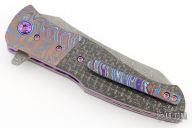 This RFK Flipper by Sean O'Hare features a Chad Nichols stainless San Mai Damascus blade with flipper. The handle has ZircuTi bolsters, silver lightning strike carbon fiber scales, anodized titanium liners with jeweled interiors, ZircuTi tip up clip and fileworked floating backspacer, anodized titanium screws and pivot collars. Nice lockup and blade seating. Comes with nylon zippered case. Excellent condition.