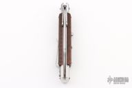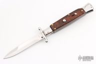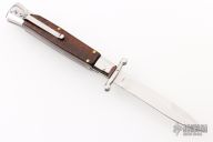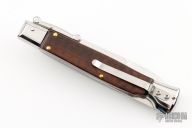 This Swing Guard Lockback Auto by AKC Italy has a polished stainless steel spear point blade with false top edge. The handle has wood scales with stainless steel bolsters, liners, and stainless steel back spacer and lock.  Includes original box and leather sheath. Excellent Condition. This one has been tuned and polished by Greg Effects.