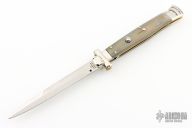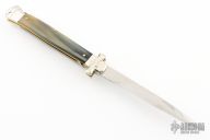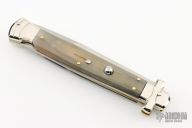 This lockback Auto by AGA Campolin has a mirror polished stainless steel spear point blade with false top edge. The handle has horn scales with mirror polished nickel silver bolsters, brass liners, stainless steel backspacer. Includes the original box. Excellent Condition.