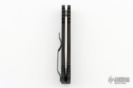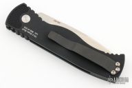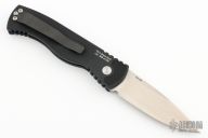 This TR-2 has a satin finished blade and a black aluminum handle inlaid with a sterling silver skull designed by Bruce Shaw. Mother of Pearl button inlay and a black stainless steel clip. Serial number 59 of 200. Comes with original box, sheath and papers. Excellent condition.