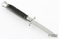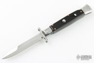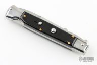 This Swing Guard Lockback Auto by AKC Italy has a polished stainless steel spear point blade with false top edge. The handle has Buffalo Horn scales with stainless steel bolsters, liners, and stainless steel back spacer and lock.  Includes original box and leather sheath. Excellent Condition. This one has been tuned and polished by Greg Effects.