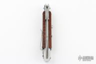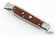 This Swing Guard Lockback Auto by AKC Italy has a polished stainless steel spear point blade with false top edge. The handle has wood scales with stainless steel bolsters, liners, and stainless steel back spacer and lock.  Includes original box and leather sheath. Excellent Condition. This one has been tuned and polished by Greg Effects.