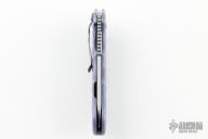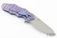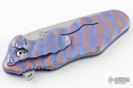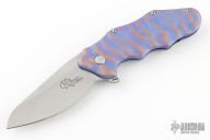 This Wrinkle from Ken Onion features a hand rub satin finished blade with notched thumbrest and flipper. The handle has a contoured and anodized titanium frame with a matching tip down clip. This knife features Ken's Speed Safe mechanism. Comes with a nylon belt sheath. Has a few light scratches, otherwise excellent condition.