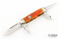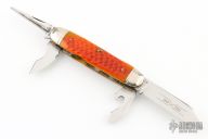 The Scout features a spear point, can opener,screw driver and a leather punch. All tools are made of stainless steel. The handle is jigged bone. The knife has brass pins, along with brass liners along the spine. Bolsters are nickel silver. Includes the original box.  Excellent Condition.
