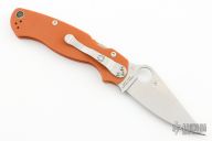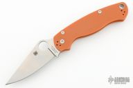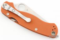 This Paramilitary 2 Linerlock Folder from Spyderco has a satin finished clip point Rex45 blade with thumbhole and notched thumb rest. Handle has orange g10 with nested stainless steel liners and stainless steel clip. Comes with original box and papers. Excellent condition.