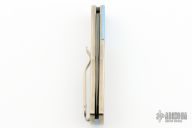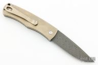 This Magic BR-1 Bolster Release Automatic from Pro-Tech Knives features a drop point Nichols Damascus blade with swedge. The handle is comprised of an orange peel finished and anodized titanium frame with checkered bolster and desert ironwood burl inlay on the "A" side of the handle. Milled and anodized titanium clip is positioned for tip up carry. Lanyard hole in the pommel. Comes with original box and papers. Excellent condition.