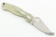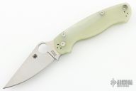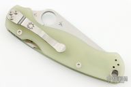 This G81GM4BKP2 Paramilitary 2 by Spyderco features a satin finished clip point blade with thumb hole, notched thumb ramp and choil. The handle is comprised of textured jade G10 scales over a stainless steel subframe and lockbar. 4 way adjustable pocket clip and lanyard tube in pommel. Includes original box and paperwork. Excellent condition.