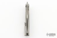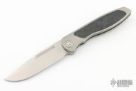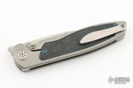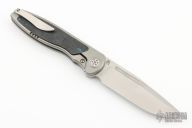 This Mini Tempest from Brian Nadeau features a hand rub satin finished drop point blade with a fuller and notched thumbrest/front flipper. The handle has a bead blasted titanium frame with Marvel Blue carbon fiber inlays, satin titanium tip up clip. Nice detent, lockup and blade seating, stainless lockface insert. Comes with original box, excellent condition.