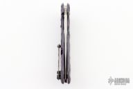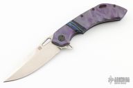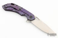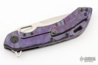 This Wayfarer 247 from Olamic Cutlery features a satin finished spear point blade, thumbhole, notched thumbrest and flipper. The handle has an anodized and sculpted titanium frame with a blue mammoth tooth inlay, anodize finished titanium pocket clip is positioned for tip up carry with a ceramic ball inlay, floating and sculpted titanium backspacer. The Wayfarer 247 is very comfortable in the hand and flips well with no wrist action needed. Blade is centered when closed and locks up with no play. s/n T1237. Comes with original box and COA dated 10/26/18. Excellent condition.
