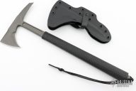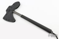 What sets the Shrike apart from other tools is the insulated rubber over-molded handle. The advantage of such a design is not only a great grip but vibration reduction and that fact that the handle is insulated. The Shrike has been tested to provide insulation up to 2,000 volts. If the tool is being used to chop through a wall and happens to connect with a live electrical wire, a good degree of protection exists from getting electrocuted. The butt end of the grip features a cap that screws off to gain access to a small storage compartment. We do sell a sharpening file that will fit the butt-cap, HERE The ax features a Tungsten Cerakote finish for corrosion and wear resistance and a low visibility look. Included is a molded, bottom-eject kydex sheath and low-ride M.O.C. straps.