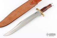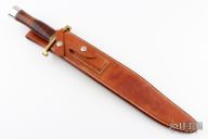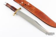 The 13" Randall Thorp Bowie by Randall Made Knives is similar to types used by Confederate troops. This one has an 13" carbon steel blade with sharpened top edge, .245" blade stock and 1.649" blade depth, hidden tang construction. The handle has a lugged brass guard, duralumin butt cap, and a stacked leather grip with red/white/blue spacers. Comes with a rough back brown leather sheath. Has some little scratches patina, otherwise excellent condition. Says "FRED CAMFIELD" on the back of the blade.