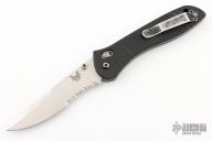This Benchmade 710 McHenry has a satin finished drop point blade with dual thumb studs and serrations. Handle is black G10 with milled ribs, and black stainless steel tip up clip. Has heavy scuffs and scratches but would make a great user.