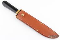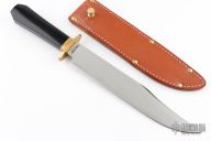 This Laredo Bowie by Cold Steel features a satin finished VG-1 San Mai blade with a nearly sharpened top edge, .294" blade stock and 1.608" blade depth, hidden tang construction. The handle has a brass guard and black linen micarta grip. Comes with brown leather sheath and original box. Has a couple light scratches, otherwise excellent condition.