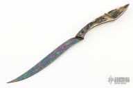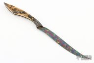 This Dragonfly by Bertie Rietveld features his Dragonskin Damascus blade that has been carved and colored, .124" blade stock and .539" blade depth, full tang construction. The handle has "Fracture" Damascus bolsters, mammoth ivory scales. The bolsters hold a Stanhope Lens with his logo, this is a really cool feature of his knives. Comes with a zippered case and COA dated May 2022. Excellent condition.