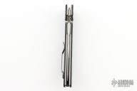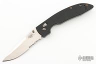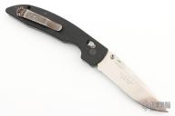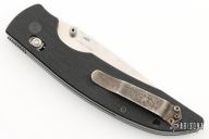 This axis-lock features tumbled drop point serrations, dual thumbstuds and a notched thumbrest.  The handle has black G-10 scales over steel liners.  Stainless steel pocket clip.  The pocket clip is scuffed up otherwise the knife is in excellent condition.