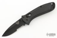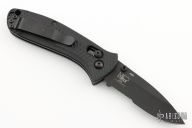 This Benchmade 5270SBK Mini-Presidio features a black coated, partially serrated drop point blade. The handle is comprised of textured Noryl GTX scales over steel liners and black Noryl GTX backspacer. Black coated tip up clip is reversible for right or left hand carry. Lanyard hole in pommel. Excellent condition.