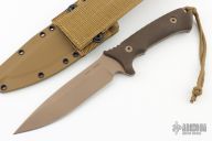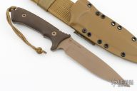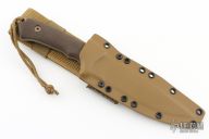 This Harsey - Difensa by Spartan Blades features a Flat Dark Earth coated spear point blade with swedge. The handle is comprised of 3D contoured canvas micarta scales over full tang construction. Exposed tang pommel with lanyard hole. Includes Coyote Brown kydex sheath. Has a couple sheath marks, otherwise excellent condition.
