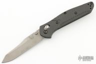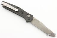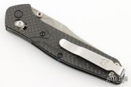 The Warren Osborne designed Benchmade 940 is a popular knife for good reason. It's a comfortable everyday carry knife with its slim design, great ergonomics and lightweight. The 940-1 has a premium CPM-S90V steel blade with a plain edge and a stonewash finish. The carbon fiber handle has stainless steel liners and blue anodized aluminum barrel spacers. The AXIS lock and reversible pocket clip make the knife usable for right and left-handers. Has some light scuffs, great condition otherwise.