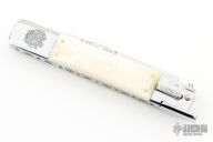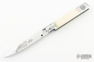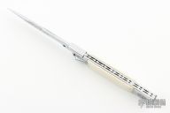 This Picklock Auto by Agasi Hambartsumian of Armenian Doctor Knives features a mirror polished bayonet ground blade with a false top edge. The handle has a polished stainless steel frame with fileworked stainless steel backspacer, bone scales with brass pins. New from maker.