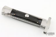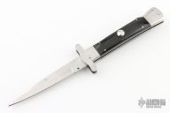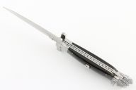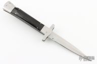 This Auto by Agasi Hambartsumian of Armenian Doctor Knives features a mirror polished blade. The handle has stainless steel bolsters and liners, buffalo horn scales with brass pins, fileworked stainless steel backspacer. New from maker.