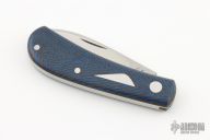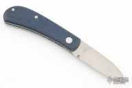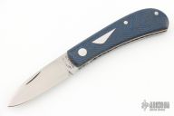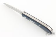 This Mini Zulu slipjoint by Nick Timpson of Birdvis Knives features a hand rub satin finished blade with nail nick. The handle has "Blue Gold Bill Payer" micarta covers, brown liners, jeweled stainless steel liners and spring. Has half-stop, flush in all positions. Comes with a leather slip sheath, original box and COA dated 3/2020. Excellent condition.