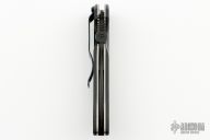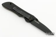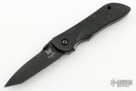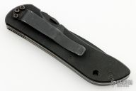 This Mini Stryker by Benchmade has a black tanto blade with notched thumbrest and a thumbdisc. The handle features black G10 scales over titanium liners, stainless steel clip, tip down carry. Has some scratches, otherwise good condition.