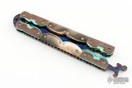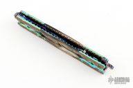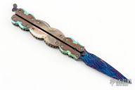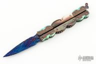 This Balisong by Suchat Custom Knives features a blued Robert Calcinore Mosaic Damascus blade with false top edge. The handle has stippled carved and anodized titanium bolsters, fileworked and anodized titanium liners, stippled and carved black lip pearl scales, mosaic Damascus latch with ruby insets. Has spring latch. Flips nice and smooth. Excellent condition. Comes with a zippered case and COA dated August 1, 2015.