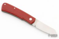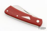 This Hitchcock slipjoint by Nick Timpson of Birdvis Knives features a satin finished blade with nail nick. The handle has red canvas micarta covers, green G-10 liners, stainless steel escutcheon, stainless steel liners and spring with textured interiors. Has half-stop, flush in all positions. Comes with original box, sheath and COA dated 4/2022. Excellent condition.