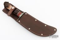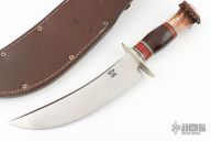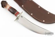 This Camp Fighter by Jim Behring features a satin finished convex ground blade with .218" blade stock and 1.676" blade depth, hidden tang construction. The handle has a nickel silver  guard, spacer pattern consisting of black/brass/white/red/aluminum, crown stag and stacked leather grip with a nickel silver pin. Comes with a brown leather sheath by Mosher. Has a few light scratches, otherwise excellent condition. Comes with a zippered case.