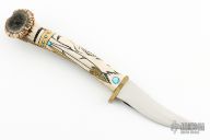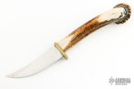 This knife by Ted Miller features a mirror polished upswept blade with .088" blade stock and 1.062" blade depth, hidden tang construction. The handle has a brass guard and a carved stag grip with turquoise inlays. Excellent condition. #8843