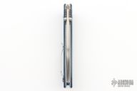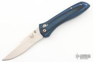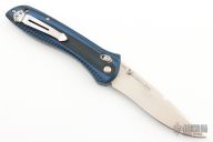 This Benchmade 710-1401 features a stonewash finished drop point blade with "710-1401 Limited" on the blade. The handle is blue/black milled G10 with the axis locking mechanism and reversible deep carry clip positioned for tip up carry. Nice action, detent and blade seating. Comes with original box and papers. Excellent Condition.