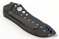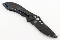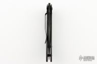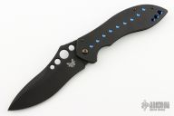 This 630BK-503 Skirmish is a Neil Blackwood Design executed by Benchmade. It features a black coated, recurved drop point blade with swedge, thumb holes and notched thumb rest. The handle is comprised of a blackened titanium frame with anodized accents over black barrel spacers. Black coated stainless steel clip is positioned for right hand, tip down carry. Includes original box, papers and drawstring pouch. Excellent condition.