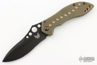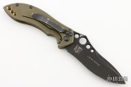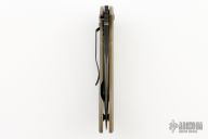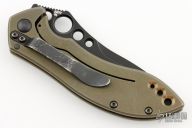This 635BK-501 Mini Skirmish is a Neil Blackwood Design executed by Benchmade and is a limited edition. It features a black coated recurved, drop point blade with swedge, notched thumb ramp and thumb holes. The handle is comprised of milled and bronze anodized titanium with a lanyard hole over black barrel spacers. Black coated stainless steel tip down clip. Includes original box, drawstring pouch, and papers. Has some scratches on the clip, blade and frame. Has been resharpened. Good user condition.