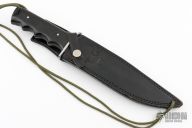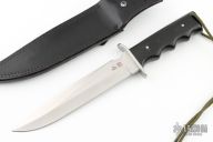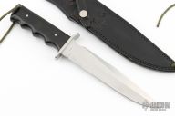 This Model 4008-B SF-SOG Special OPS knife from Al Mar features a satin finish, clip point bowie style blade. The handle is comprised of stainless steel guard and black paper micarta handles with lanyard tube in pommel. Comes with original black leather sheath with "T.G." on the front. The SF logos have been removed from the back of the blade along with the serial number. Has some scratches and scuffs, otherwise good user condition.
