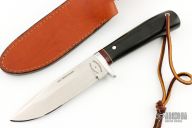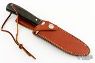 This Colorado Scout by Colorado Cutlery features a satin finished blade with false top edge, .173" blade stock and 1.296" blade depth, hidden tang construction. The handle has an aluminum guard, black linen micarta grip with white and red linen micarta spacers, lanyard hole. Comes with a brown leather sheath. Has a couple light scratches, otherwise excellent condition. First Production Run.
