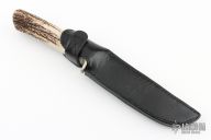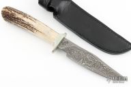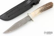 This Hunter by Jerry Kennedy features a Damascus blade with .216" blade stock and 1.139" blade depth, hidden tang construction. The handle has a nickel silver guard with a stag grip. Comes with a black leather sheath and a zippered case. Excellent condition.