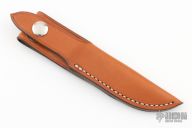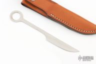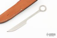 This Bird Knife by Terry Barrett features a satin finished blade and handle, .059" blade stock and .538" blade depth, full tang construction. The handle has a ring at the butt for your pinky so that you let the knife fall and hang from your finger while cleaning birds, then quickly bring it back up when you need it. Comes with a brown leather sheath. Excellent condition.